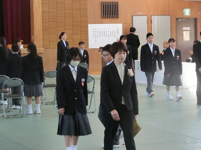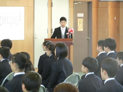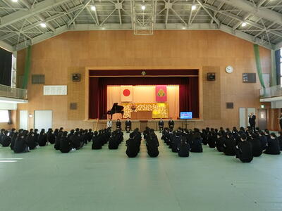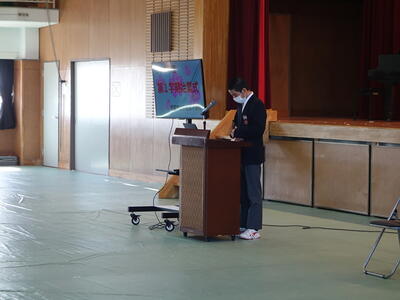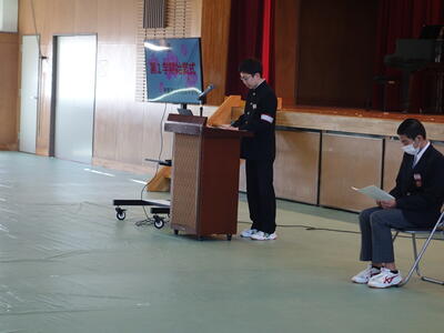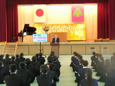 続いて、1学期の始業式が行われ、校長先生からは「宇佐美中でよかった」と思えるようになってほしいという願いと、「仲間と共に自ら学ぶ」こと、「自ら判断し行動する」ことの大切さをお話いただきました。続いて、2年生の代表生徒からは「授業態度」「復習」「仲間との思い出づくり」について、3年生の代表生徒からは「部活動での目標達成」「学習習慣の確立」「希望する進路の実現」について、1年の決意が述べられました。