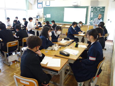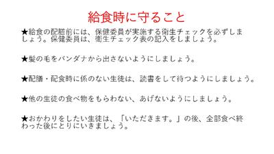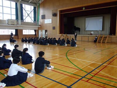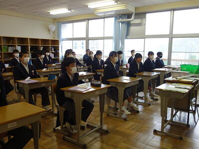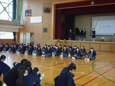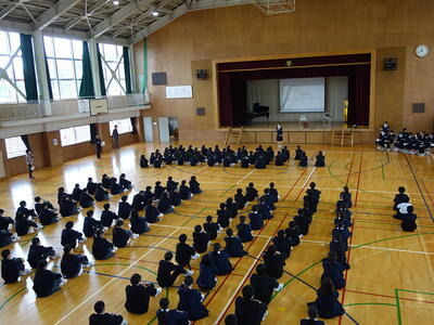 今回の集会では、昨年度から変更された3点(①部活動終了(完全下校)時刻が16:30 ②宇中祭 文化の部→宇中祭 合唱の部 ③前期までで学習委員会と生活委員会が終了し、後期から学生委員会(仮)発足)を確認し、1期の「基板」について話を聞きました。その後、学習・生活・給食・清掃について、様々な宇佐美中での活動を確認しました。