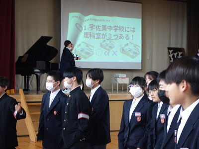 新入生と2、3年生の顔合わせと、宇佐美中について知ってもらうことを目的に、生徒会が対面式とレクリエーションを行いました。拍手で迎え入れられた新入生は、宇佐美中の生徒会活動について真剣に耳を傾けていました。その後、宇佐美中や先生方に関する○✕クイズを実施し、新入生は楽しみながら宇佐美中について知ることができたようです。最後に、新入生の代表生徒から、お礼の言葉が述べられました。