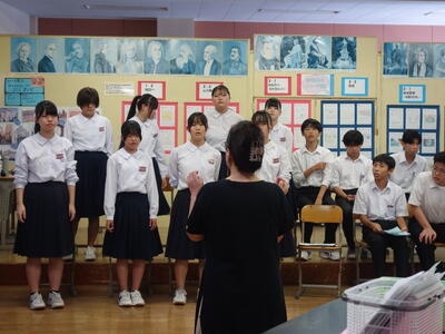 3年生の音楽の授業の時間、伊東市少年少女合唱団でも合唱指導をされている講師の方をお招きし、合唱コンクールで歌う歌の指導をしていただきました。1組も2組も、限られた時間ながらもたいへん熱心なご指導をいただき、合唱に対して意識の向上が見られました。